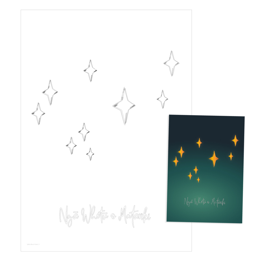 Welcome the Māori New Year with a hands-on artwork. Ngā Whetū o Matariki – Colour-In Edition (2025) transforms Willa Black’s original star cluster into a mindful creative experience. Add your own hues to the whetū that symbolise remembrance, gratitude, and new beginnings, then frame your finished piece as a meaningful reminder throughout the year. Printed in Aotearoa on premium stock and supplied with a mini reference sheet of the original art.