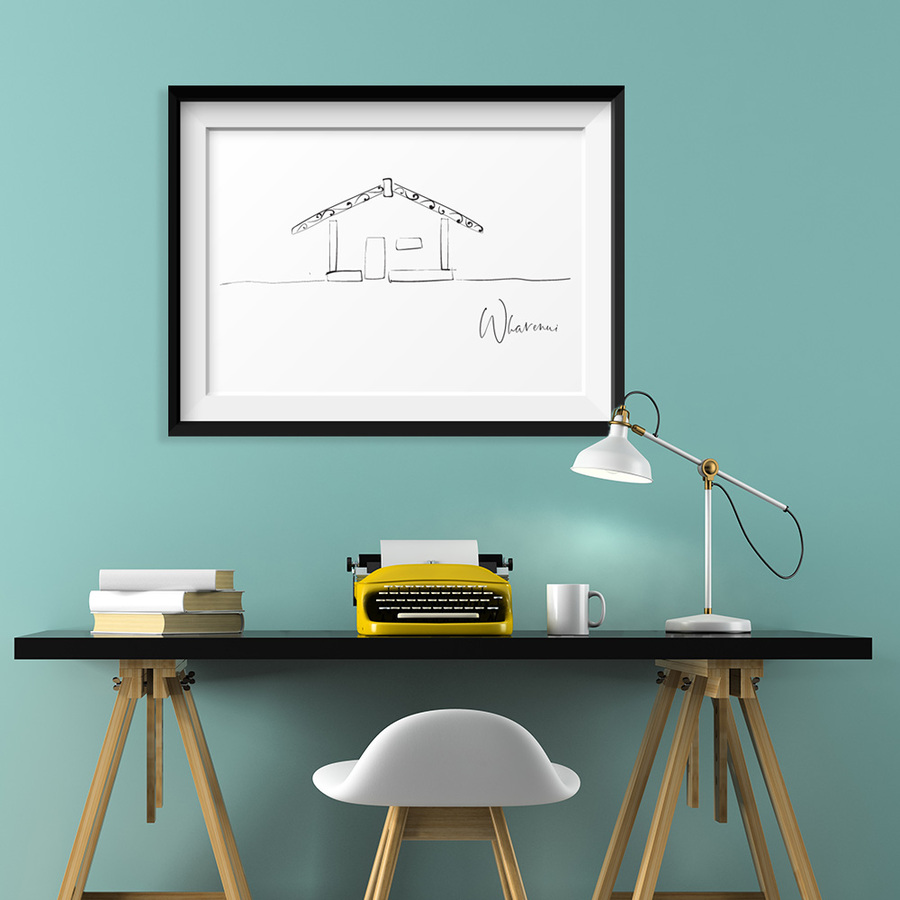 Wharenui – Māori Line Art Print of a Meeting House. Hand‑drawn and created in digital format, this minimalist depiction of a traditional wharenui (meeting house) brings architectural and cultural storytelling into your home or workspace. A simple black and white print for a lounge, hall or entrance way (Pictured: A2, Black Frame with Mat Board)