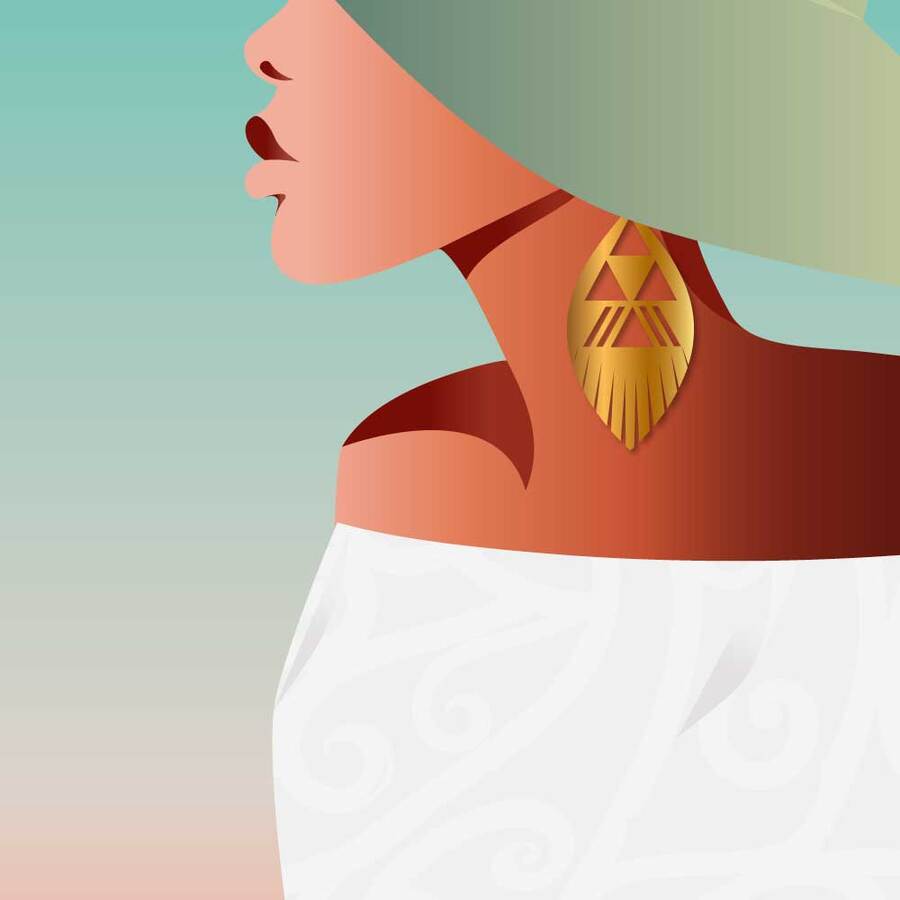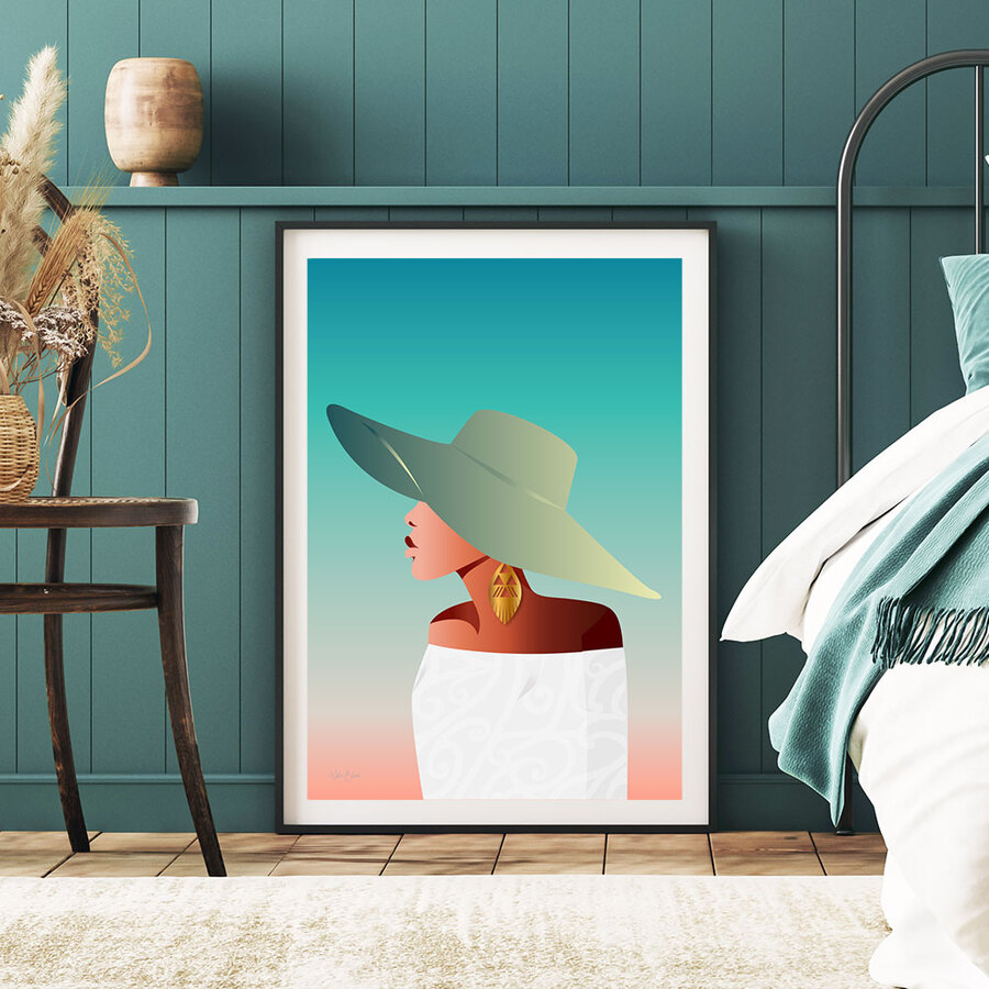 This artwork features a woman adorned in a wide-brimmed hat, gold feather earrings featuring Māori inspired patterns taken from the traditional Tāniko weaving. Wajan wears soft off-shoulder attire — symbolising elegance and the quiet confidence of women who carry generations of story. With warm earthy tones and cool gradient skies, this print aptly name Wahine of Sand & Sea radiates serenity and strength — a perfect centerpiece for your modern, boho, or cultural home aesthetic.